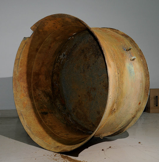 銅鼓的首個發現者,是陽東縣大八鎮周亨村委會朝塘村農民李學輝,男,58歲,未婚。2009年4月13日上午,他前往哥哥家里借牛耙田,路過周亨河支流(小河)馬墳河,這里距離村委會半市里,距離水罩村6.7市里;小河邊一塊由推土機推平準備挖魚塘的土地,經大雨沖刷后,地面露出一個約10厘米大而生銹的東西,李學輝以為是廢鐵,上前想把它弄出來賣錢,由于這“東西”沉埋深而弄不出來,他即到哥哥家里借鋤頭等工具,并叫哥哥和嫂子幫忙。下午五時許,他們三人才把“東西”挖出,但搬不上地面,李叫前來圍觀的幾位農民幫助,經眾人合力,終于把約有700~800市斤重的“東西”推拉上地面,這“東西”顯露出銅質面目。他們先向當地派出所報告并把“東西”運到派出所,后又向《陽江日報》社報告。當天晚上11時許,《陽江日報》記者趕到現場采訪。