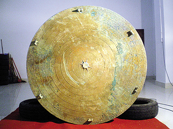 銅鼓面直徑142厘米,高82厘米,束腰狀,無封底,鼓面鑄同心圓條紋,中心是一個八角星,周邊平均分布著六個蛙狀突起物,鼓腰中部對稱分布兩對鼓環,整個器物全為銅質。銅鼓基本完整,叩時發出洪亮的金屬聲響。經省文物考古所多位專家初步考證,認為該銅鼓是全省目前所發現的體積最大的銅鼓,其高度為全國第一,鼓面面積為全國第二,體積居世界第三。專家認為該銅鼓是中國古代西南地區少數民族使用的重要器物。