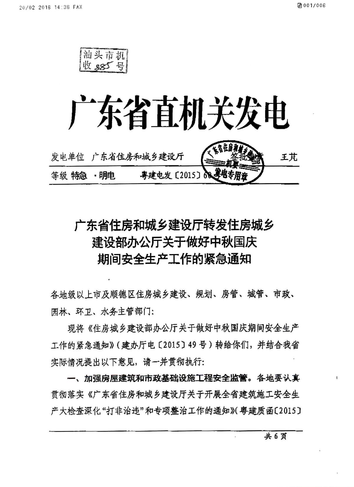 現將《廣東省住房和城鄉建設廳轉發住房城鄉建設部辦公廳關于做好中秋國慶期間安全生產工作的緊急通知》(粵建電發﹝201560號)轉發給你們,請遵照執行。