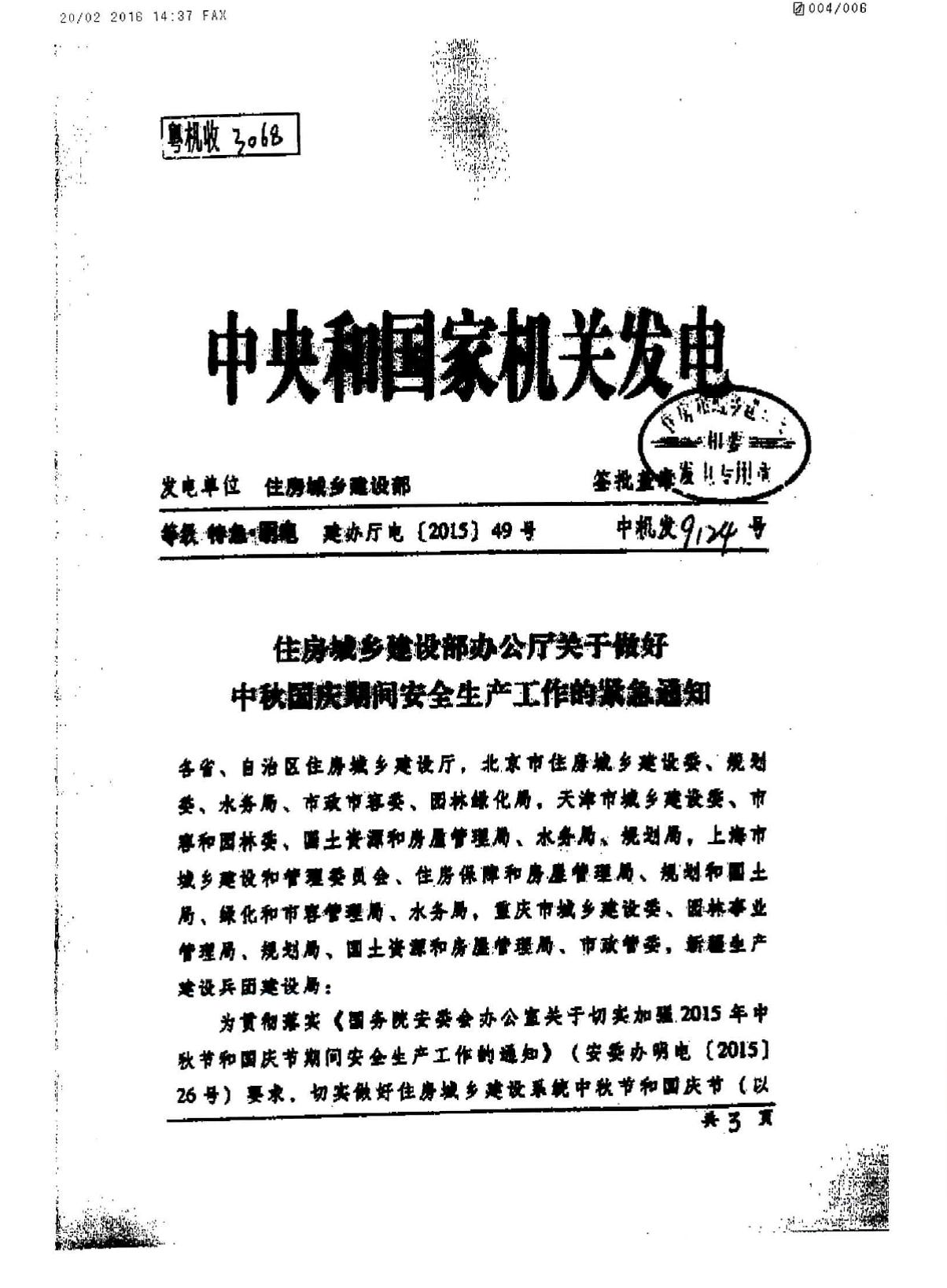 轉發關于做好中秋國慶期間安全生產工作的緊急通知(陽住建通〔2015〕174號)
