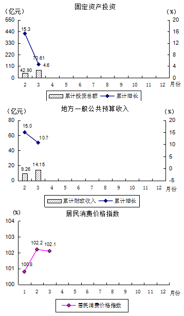 二、投資增速明顯回升,項目投資支撐較大。一季度,全市完成固定資產投資70.61億元,同比增長4.6%,比上年同期提高8.3個百分點。其中,項目投資41.63億元,增長11.8%;工業(yè)投資22.39億元,增長2.9%;工業(yè)技改投資1.06億元,增長46.0%;裝備制造業(yè)投資3.09億元,增長92.3%;基礎設施投資28.91億元,增長17.5%。