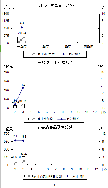 一季度,全市經濟運行總體平穩(wěn)。實現(xiàn)地區(qū)生產總值(GDP)299.74億元,同比增長5.3%。其中,第一、二、三產業(yè)分別增長3.5%、1.2%和10.0%。主要經濟指標情況如下: