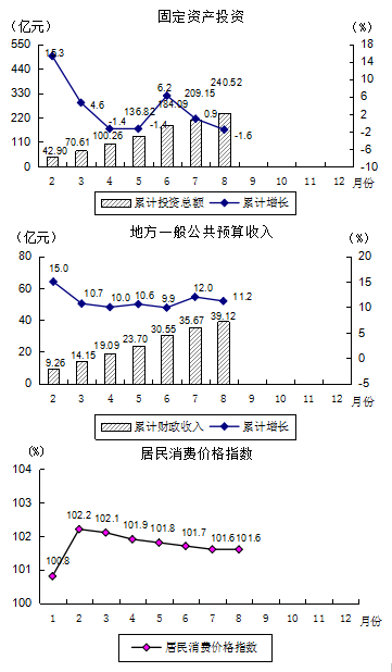 二、投資呈現回落態勢。1-8月,全市完成固定資產投資240.52億元,同比下降1.6%。其中,項目投資147.29億元,增長3.2%;房地產開發投資93.24億元,下降8.4%;工業投資91.07億元,增長21.9%;裝備制造業投資16.66億元,增長113.8%;基礎設施投資98.70億元,增長5.8%。