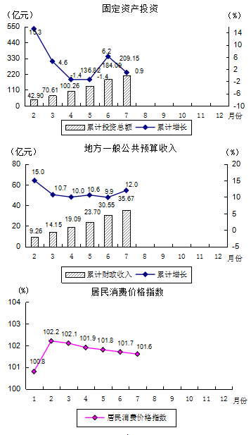 二、投資呈現(xiàn)低位增長。1-7月,全市完成固定資產(chǎn)投資209.15億元,同比增長0.9%。其中,項目投資131.35億元,增長9.6%,拉動全市投資增長5.6個百分點;房地產(chǎn)開發(fā)投資77.80億元,下降11.1%;工業(yè)投資82.88億元,增長23.4%;裝備制造業(yè)投資15.93億元,增長142.5%;基礎(chǔ)設(shè)施投資87.20億元,增長8.7%。
