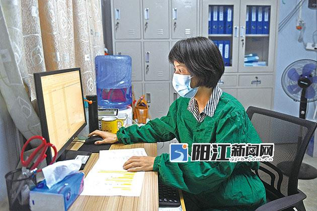14日零時許,脫下防護裝備的陳俏在電腦前登記樣本檢測信息。 宋福亮 攝